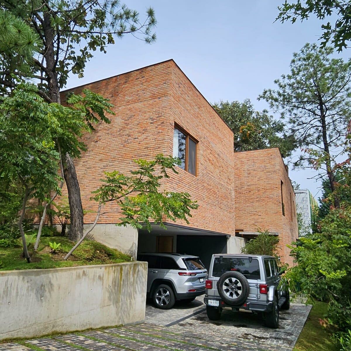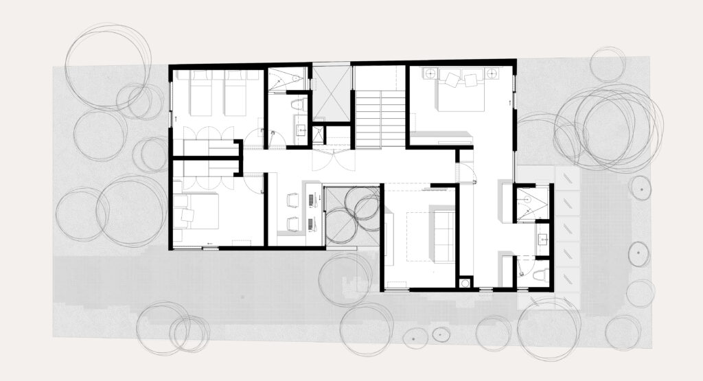 Côté rue, un talus arboré existant est conservé afin de préserver l’intimité de l’habitation et de limiter les vis-à-vis. Le projet s’inscrit dans la topographie naturelle du site et établit un dialogue étroit avec la végétation existante.