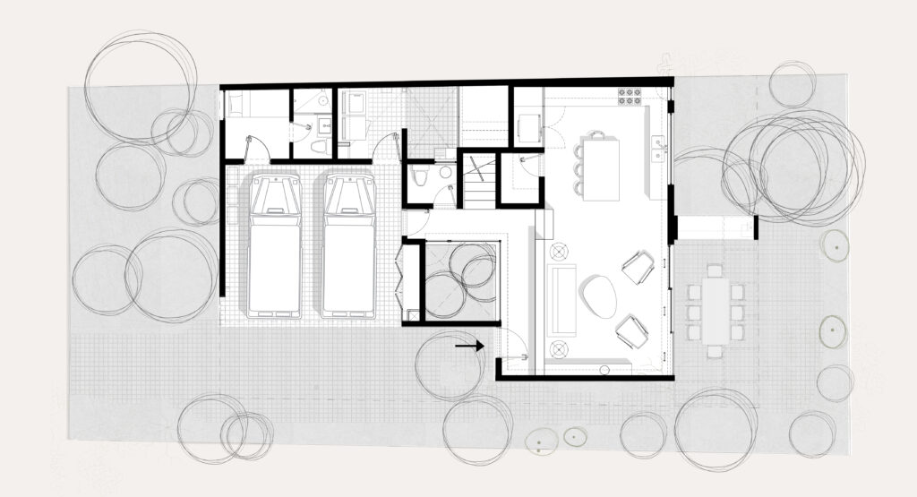 Un patio central structure et met en scène les circulations intérieures. Les espaces de vie s’ouvrent largement sur le jardin situé en fond de parcelle, tandis que la volumétrie depuis l’entrée se présente volontairement plus fermée.